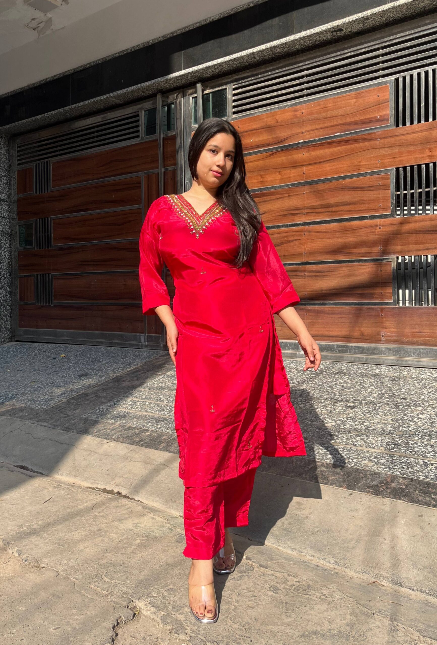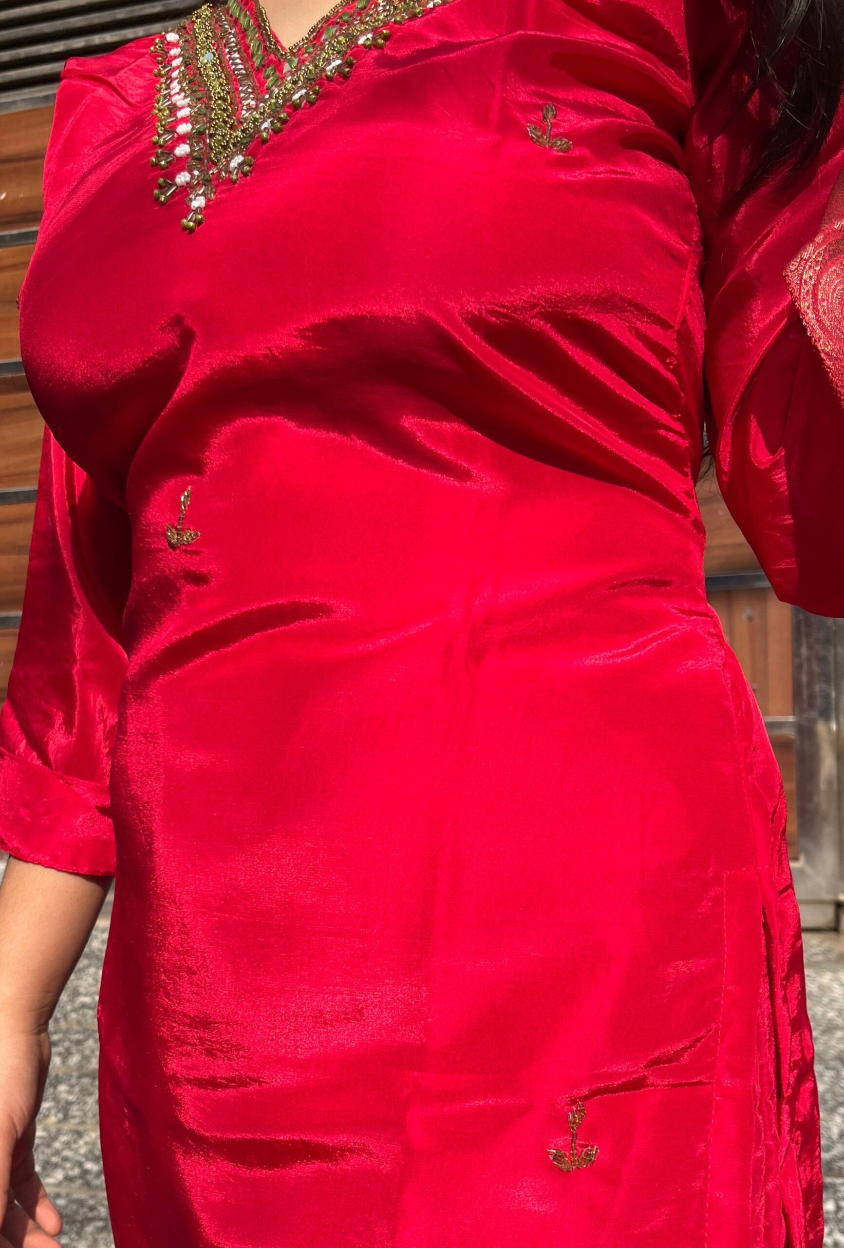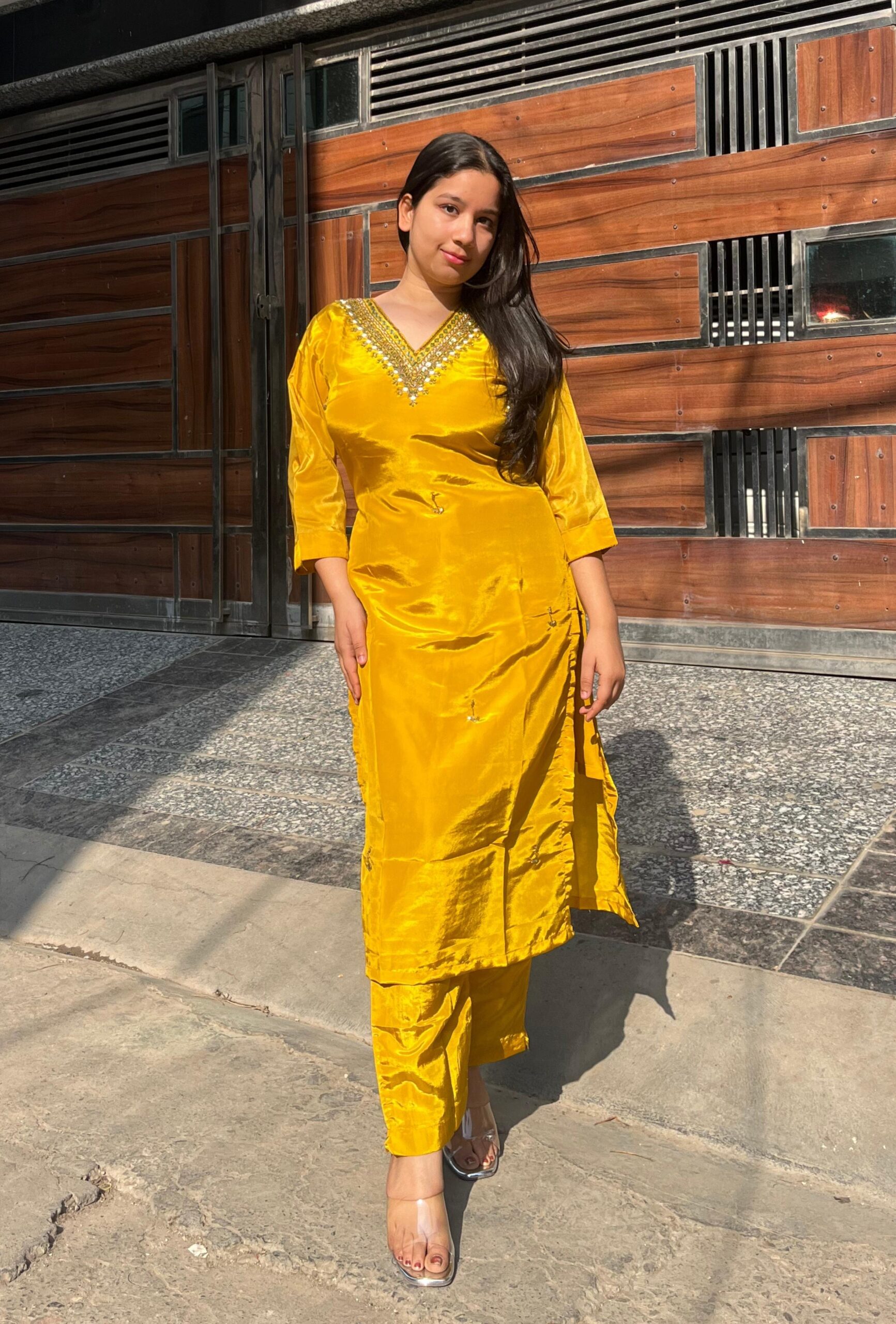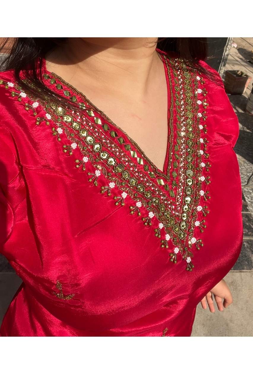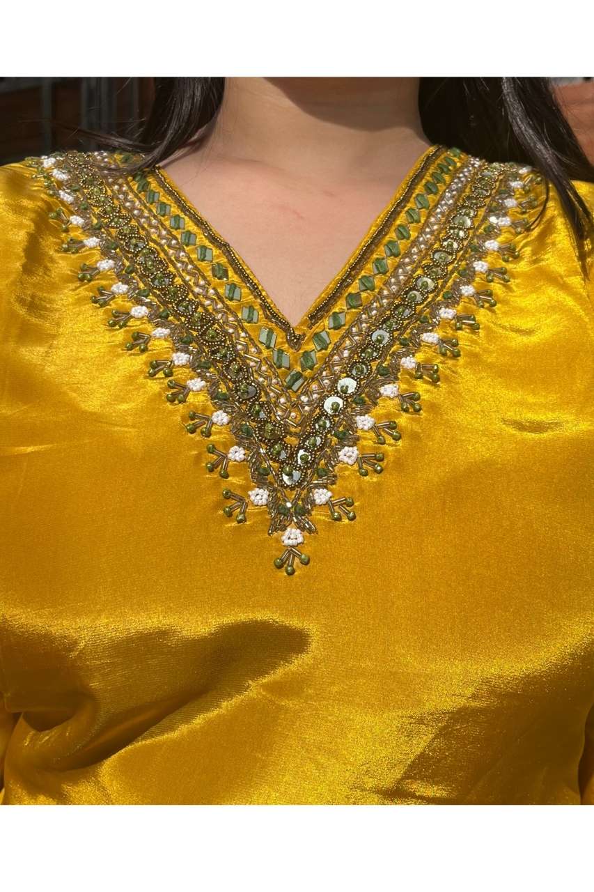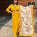 Chic American crepe suit set designed with a smooth, elegant fall. The kurti features handwork on the neckline, adding a refined highlight, while the printed dupatta brings a soft contrast and graceful charm. A perfect blend of comfort, detail, and everyday elegance.