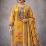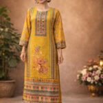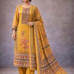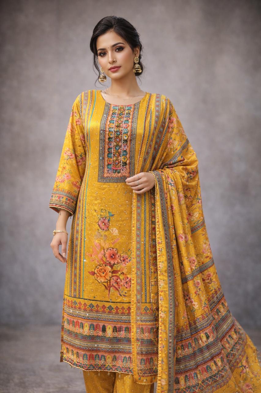 Crafted in chinnon fabric, this suit features a straight-cut kurta that offers a clean, structured silhouette. The neckline is highlighted with subtle stone detailing, adding a soft touch of shimmer without overpowering the look. Lightweight, graceful, and easy to carry, this piece is ideal for those who prefer understated elegance with refined detailing.