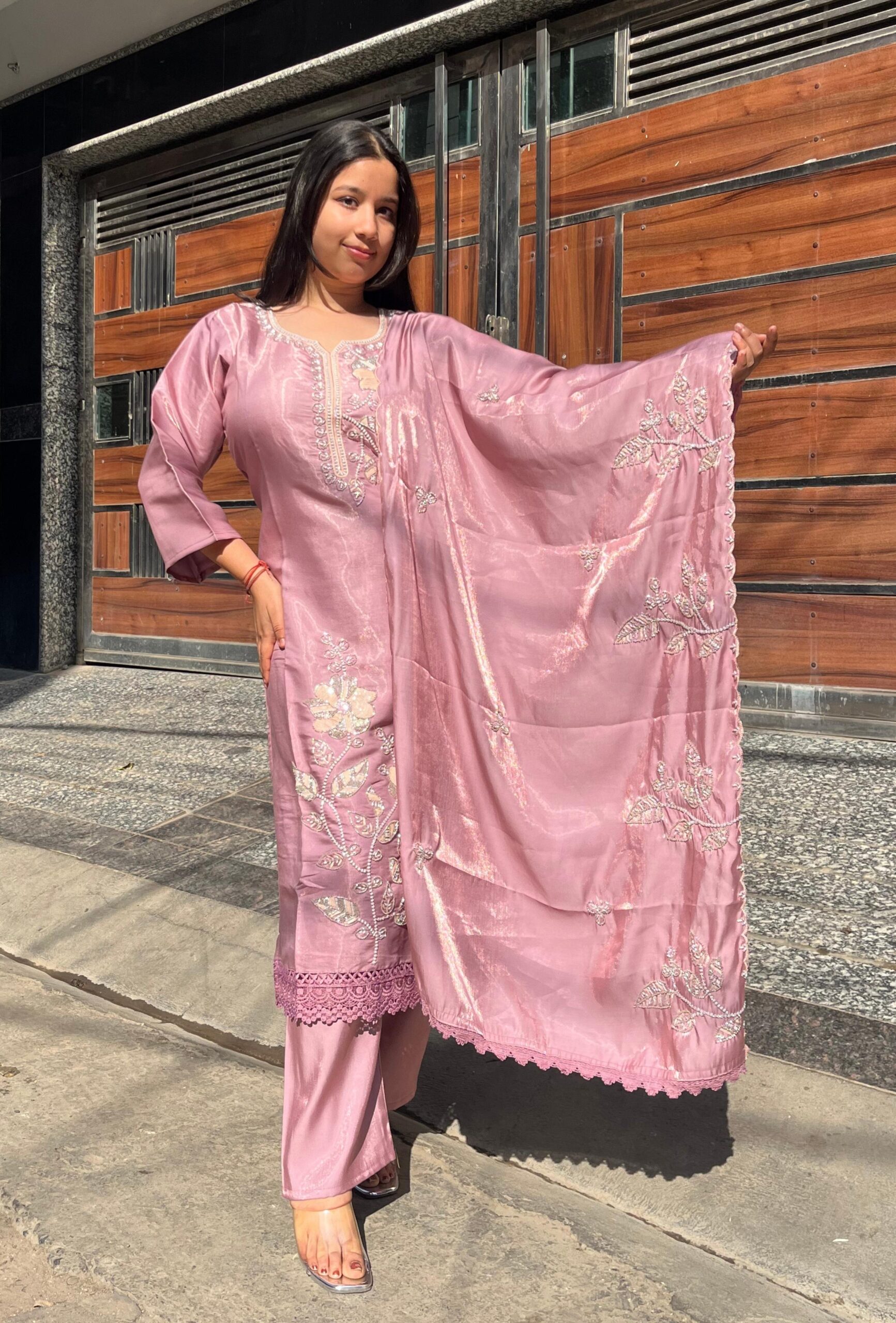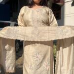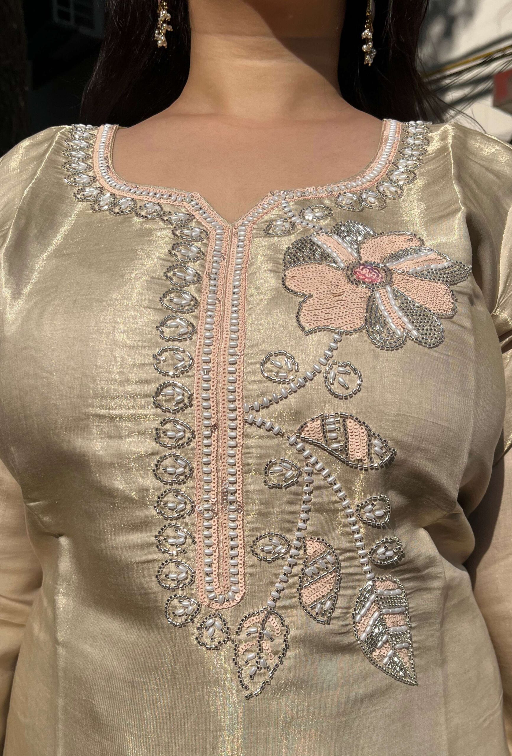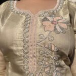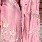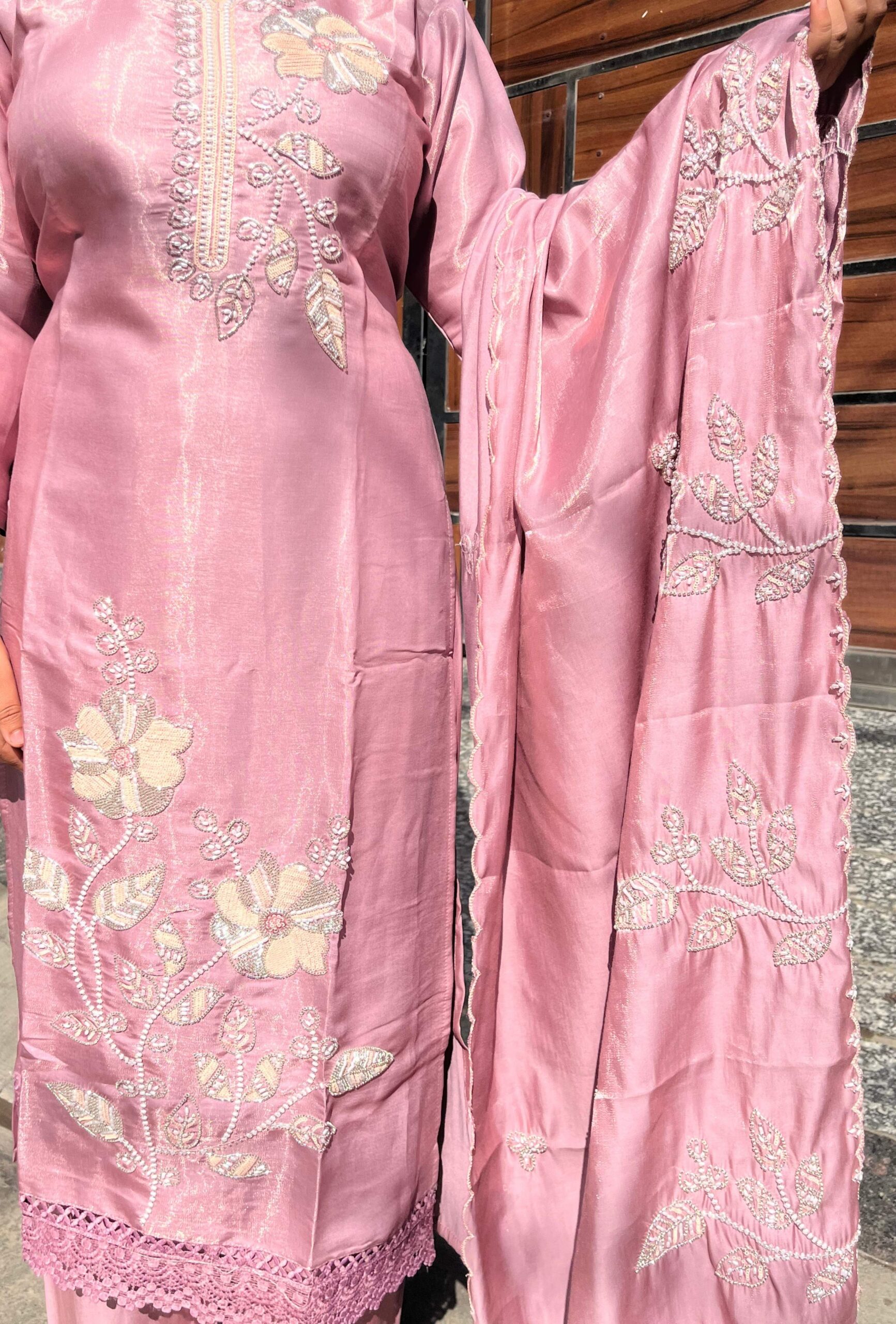 Graceful glass organza suit set featuring heavy and refined handwork on both the kurti and dupatta. The intricate detailing adds depth and luxury, while the soft sheen of the fabric enhances its graceful appeal.