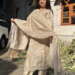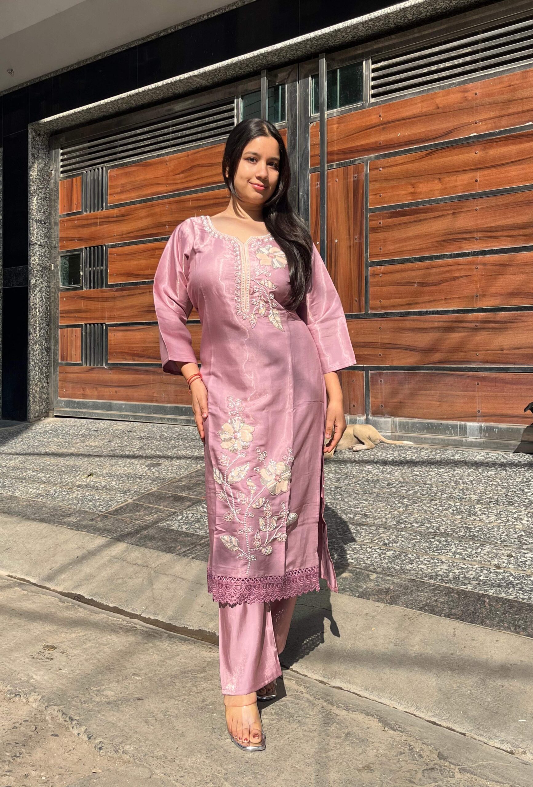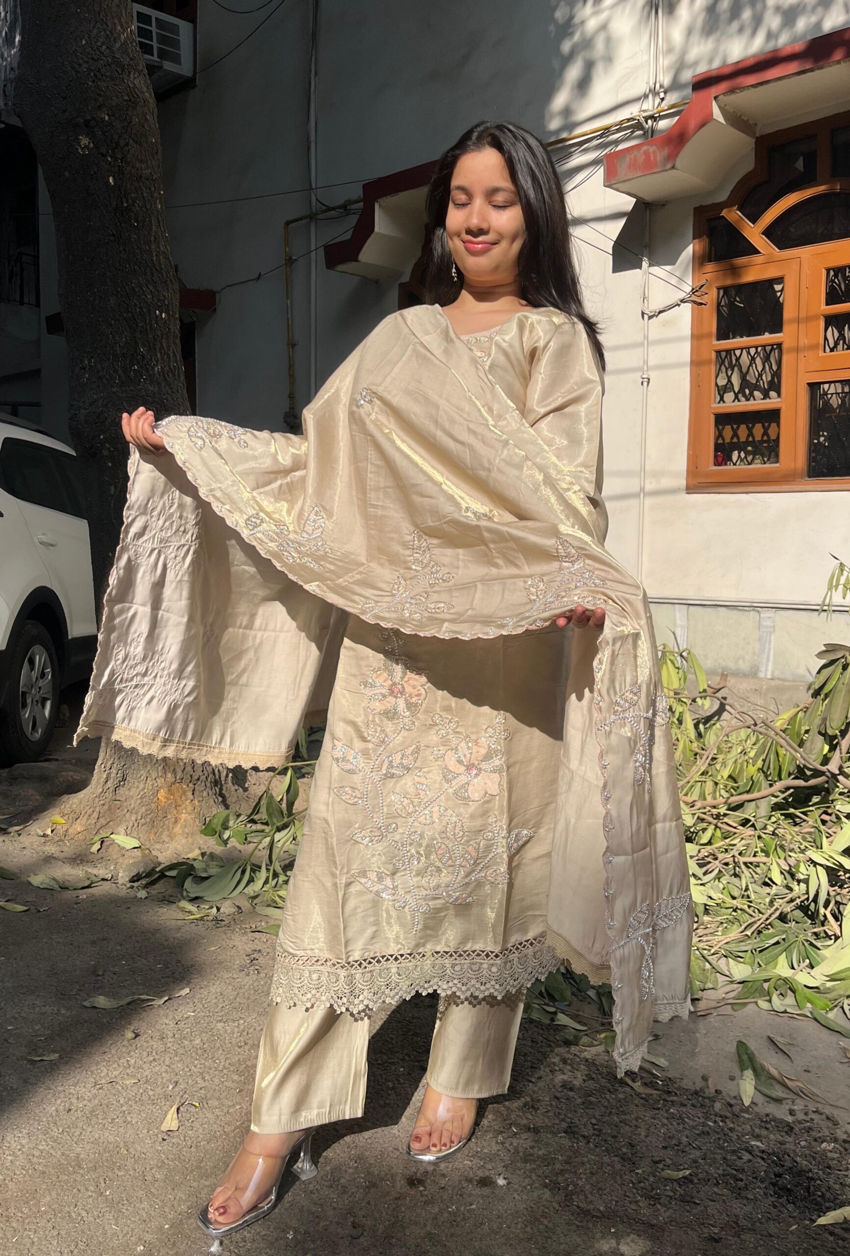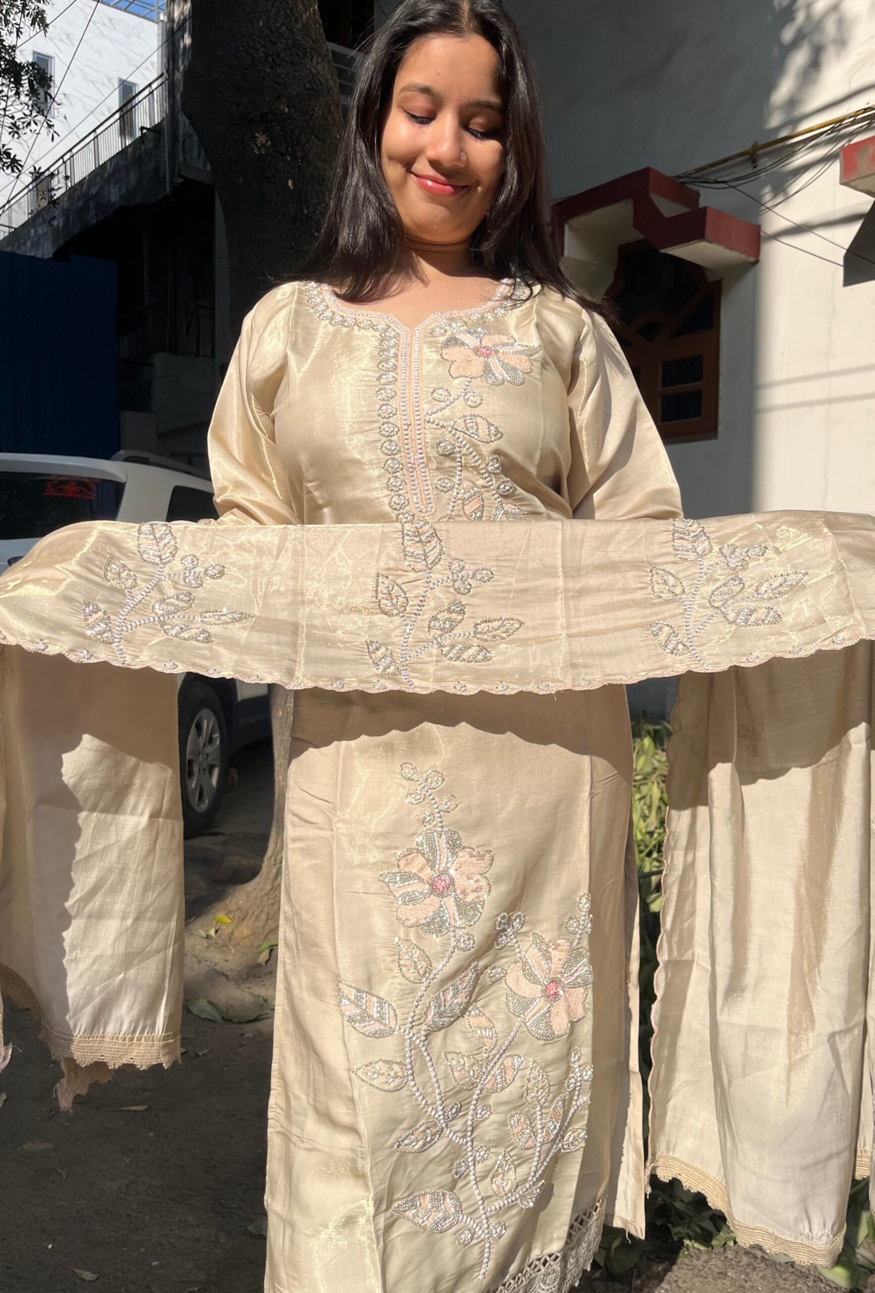 Graceful glass organza suit set featuring heavy and refined handwork on both the kurti and dupatta. The intricate detailing adds depth and luxury, while the soft sheen of the fabric enhances its graceful appeal.
