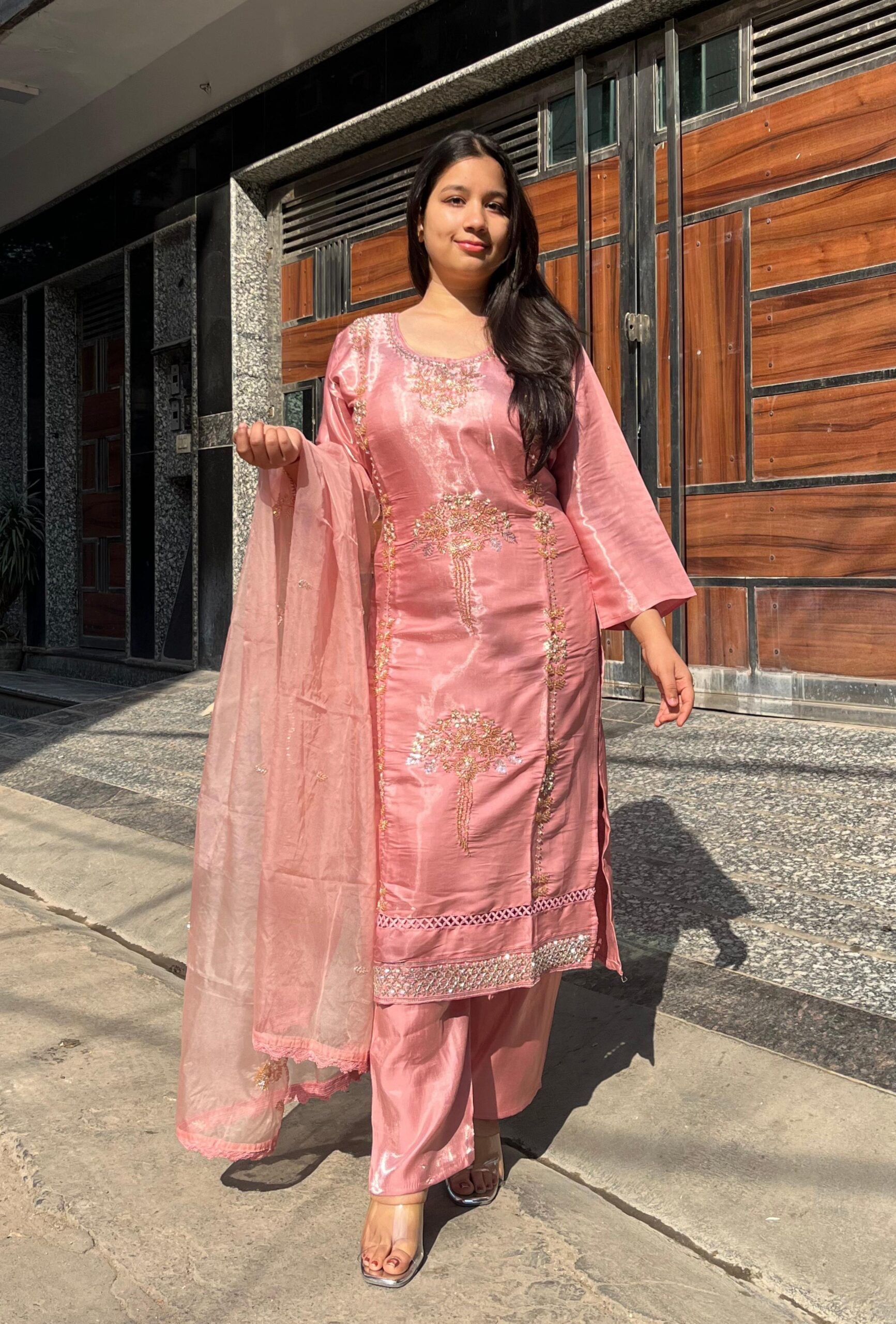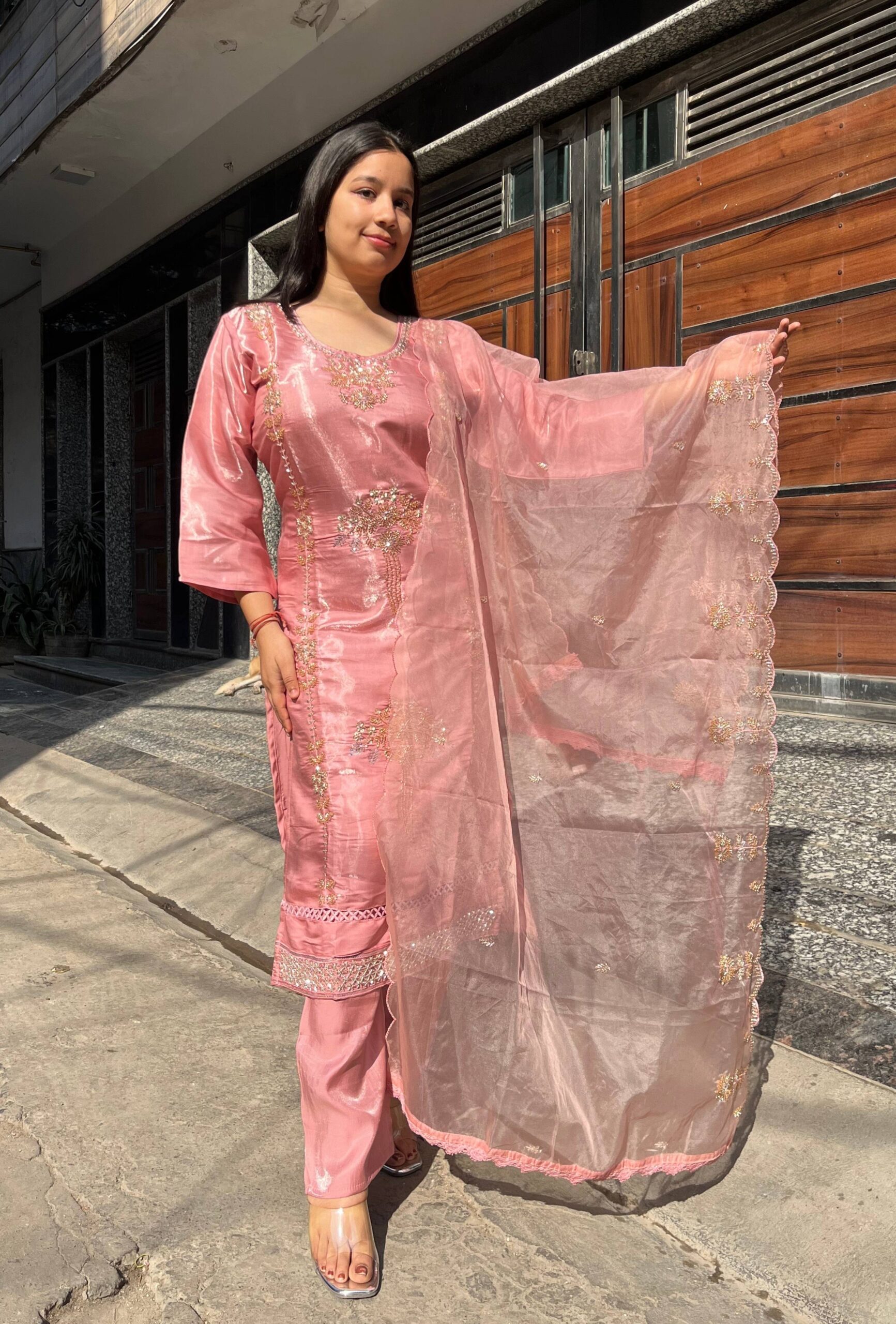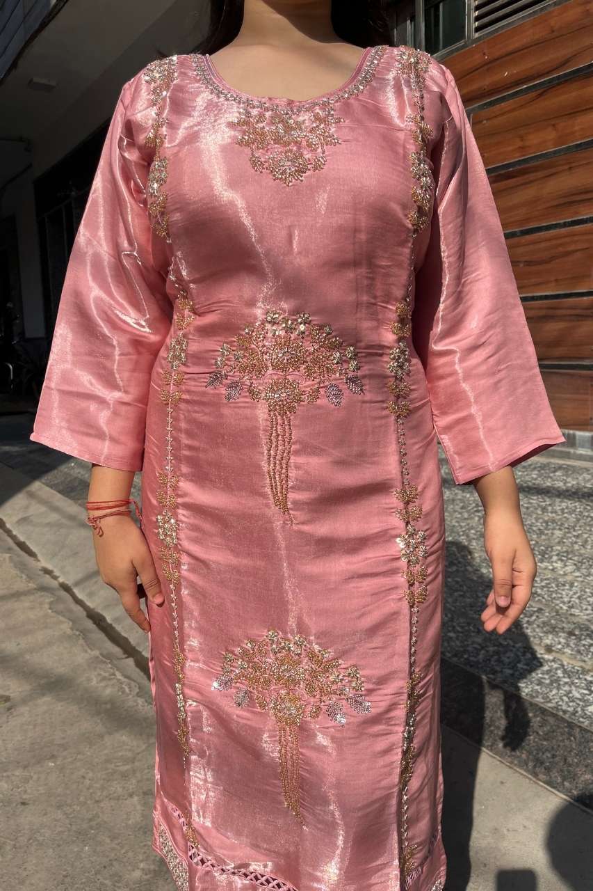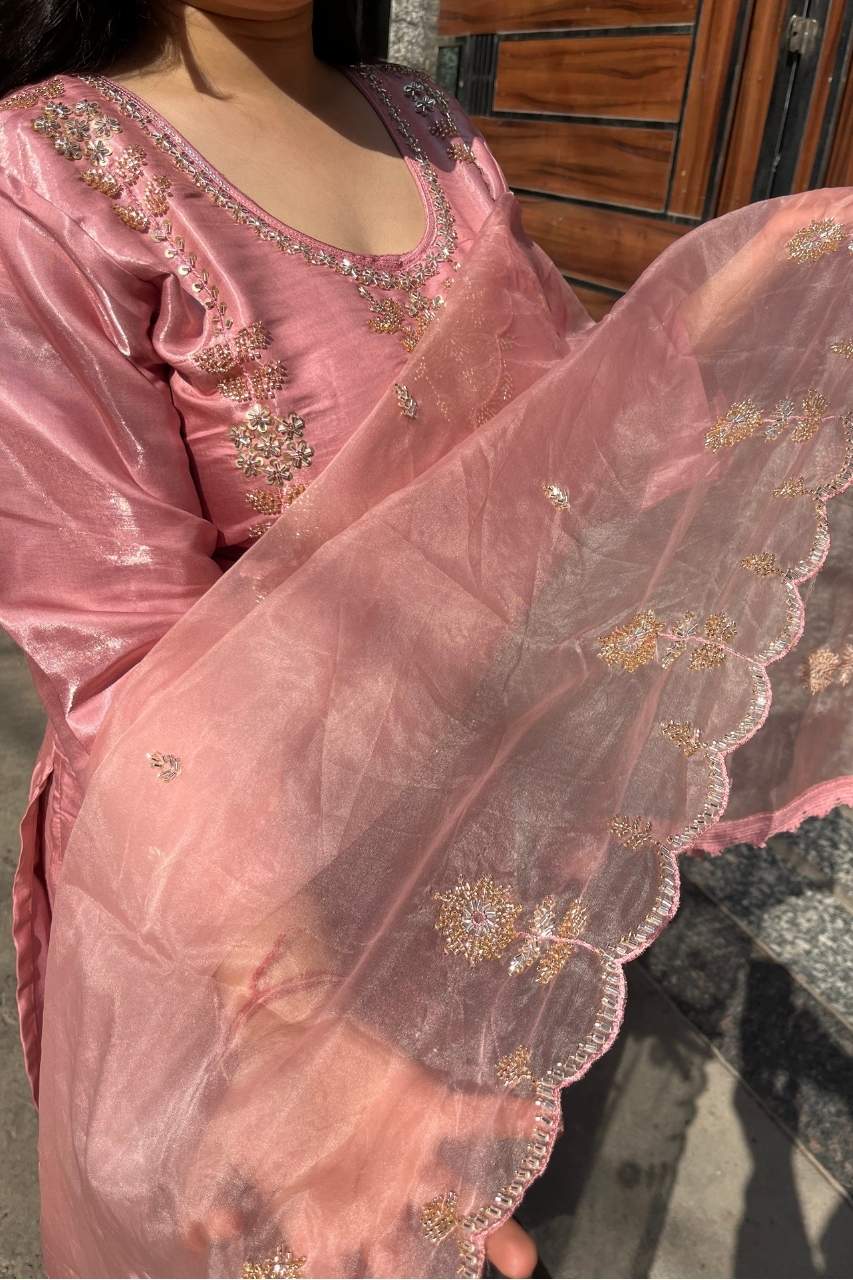 A luxurious glass organza suit set featuring very heavy handwork on the top and dupatta, creating a rich and striking finish. The delicate sheen of glass organza enhances the intricate detailing, giving this ensemble a graceful yet statement-making look. A beautifully crafted outfit for those who appreciate fine workmanship and elevated style.