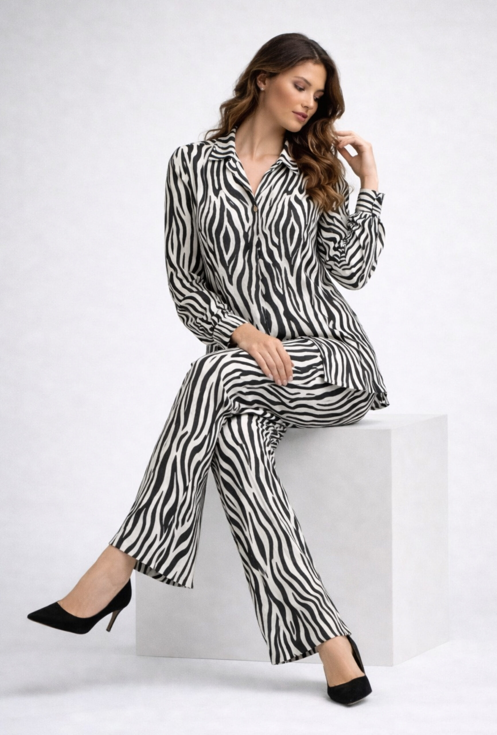 crafted in pure crepe fabric for an effortlessly elegant drape. Designed in a striking ivory and black zebra print, this co-ord blends modern sophistication with bold style.