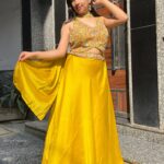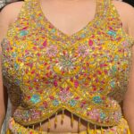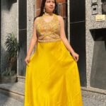 The flowy lehenga skirt drapes gracefully, creating a flattering silhouette that moves beautifully with every step. Perfect for haldi ceremonies, festive gatherings, and wedding celebrations, this ensemble strikes the ideal balance between comfort and glamour.