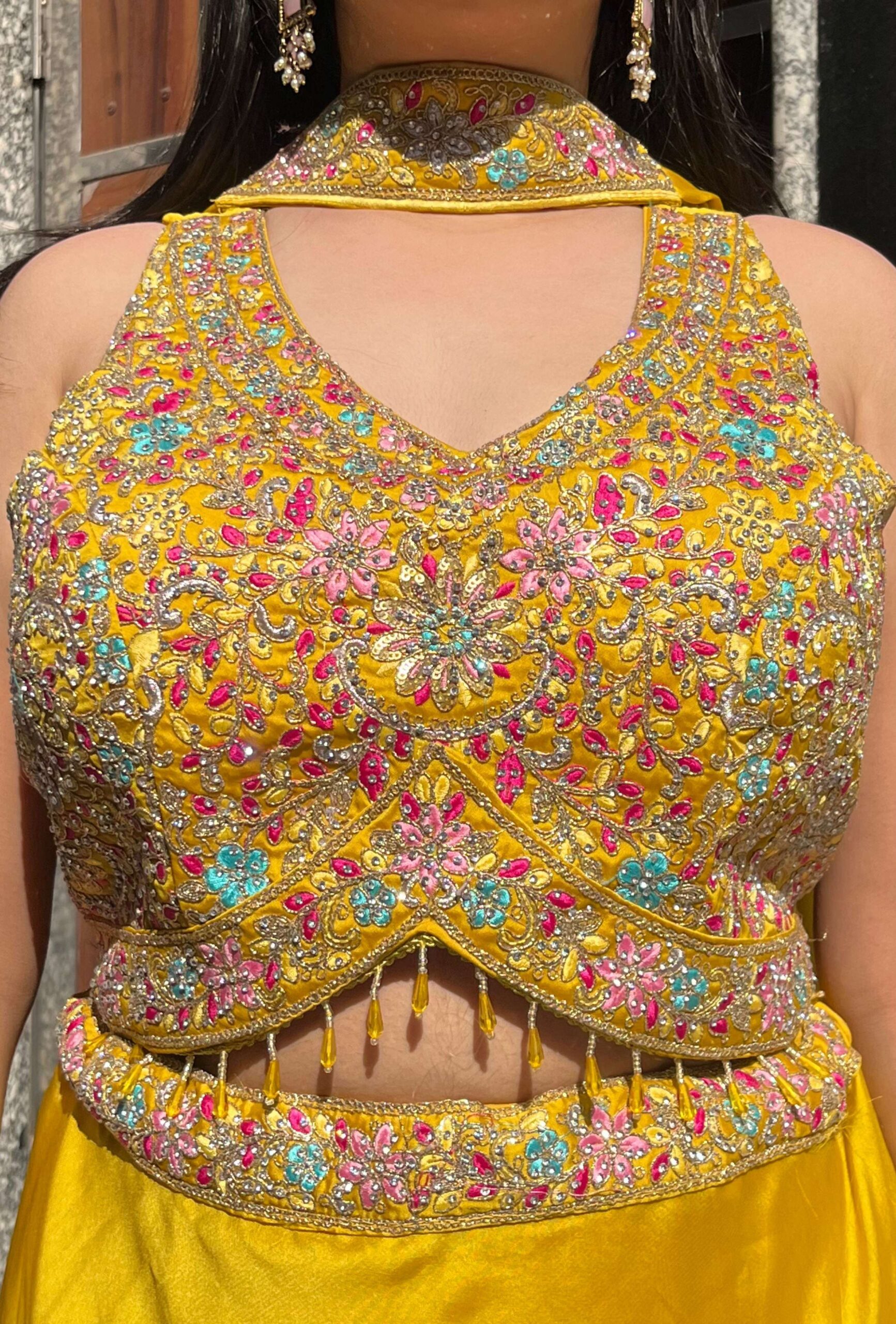 Step into festive elegance with our Marigold Glow Embellished Lehenga Set, designed to bring effortless charm and celebration-ready appeal. Crafted in a radiant marigold yellow hue, this lehenga set features a beautifully hand-embellished blouse with intricate detailing that adds a rich, festive sparkle.